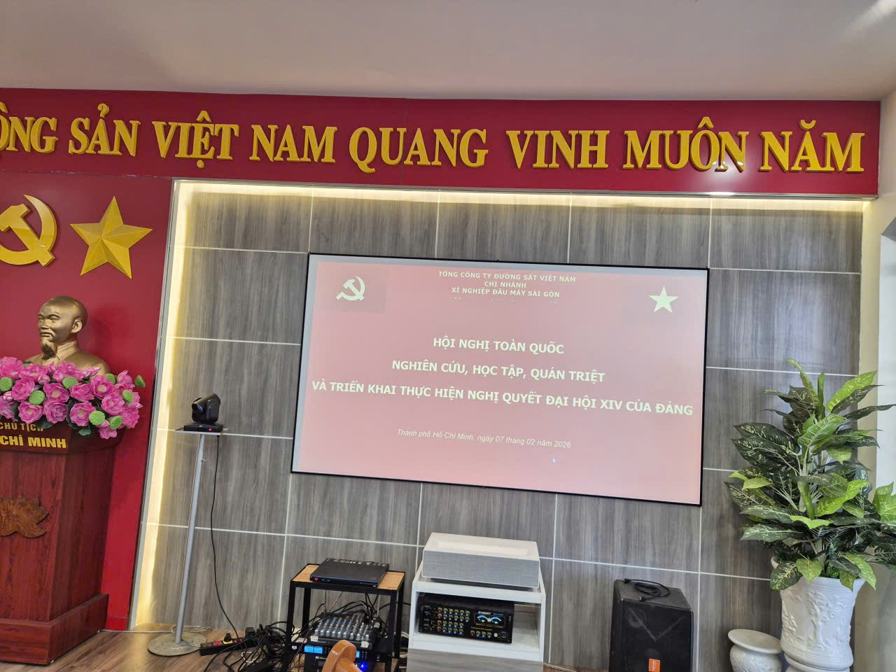 Ngày 07/02/2026, trong không khí thi đua lập thành tích chào mừng thành công của Đại hội đại biểu toàn quốc lần thứ XIV của Đảng, thực hiện Công điện số 129-CĐ/ĐU ngày 04/02/2026 của Đảng ủy Tổng công ty Đường sắt Việt Nam (ĐSVN), Đảng bộ Chi nhánh Xí nghiệp Đầu máy Sài Gòn đã tổ chức cho toàn thể cán bộ, Đảng viên tham gia Hội nghị trực tuyến toàn quốc nghiên cứu, học tập, quán triệt và triển khai thực hiện Nghị quyết Đại hội XIV của Đảng.